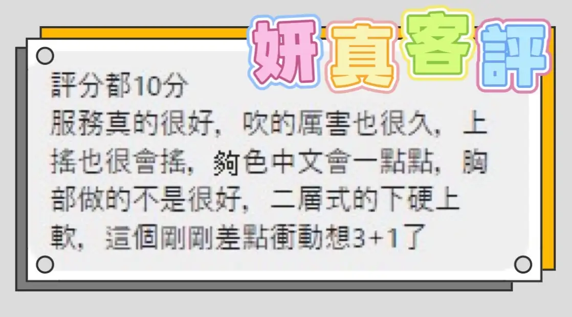 可配合 :奶砲,按摩,69,共浴,LG(舌吻)依氣氛衛生而定,可親嘴,無套吹,口爆,品鮑,舔蛋,浴中蕭,深喉嚨,變裝(自備免付),絲襪(自備免付),玩具(按摩棒),玩具(跳蛋),情趣用品(客自備),快餐,2S