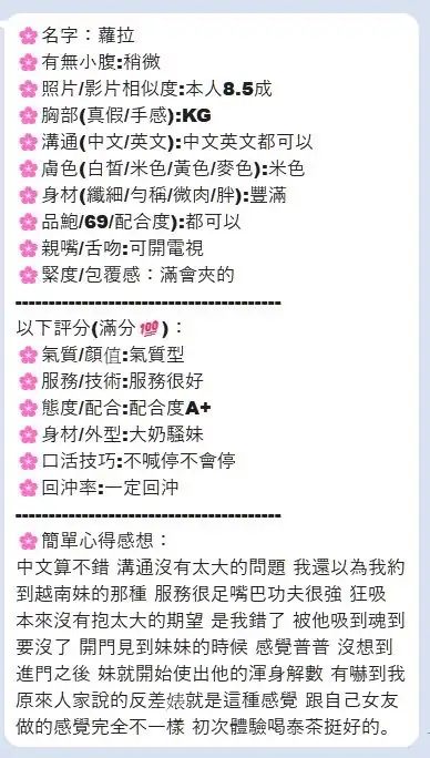 可配合 :奶砲,按摩,69,共浴,LG(舌吻)依氣氛衛生而定,可親嘴,無套吹,口爆,足交,潮吹(依貴賓技術而定),品鮑,舔蛋,奶推,屁推,深喉嚨,變裝(自備免付),絲襪(自備免付),玩具(按摩棒),玩具(跳蛋),情趣用品(客自備),無套做,無套內射,白人,中文溝通,英文溝通,快餐,2S,NS,包夜,射後清槍