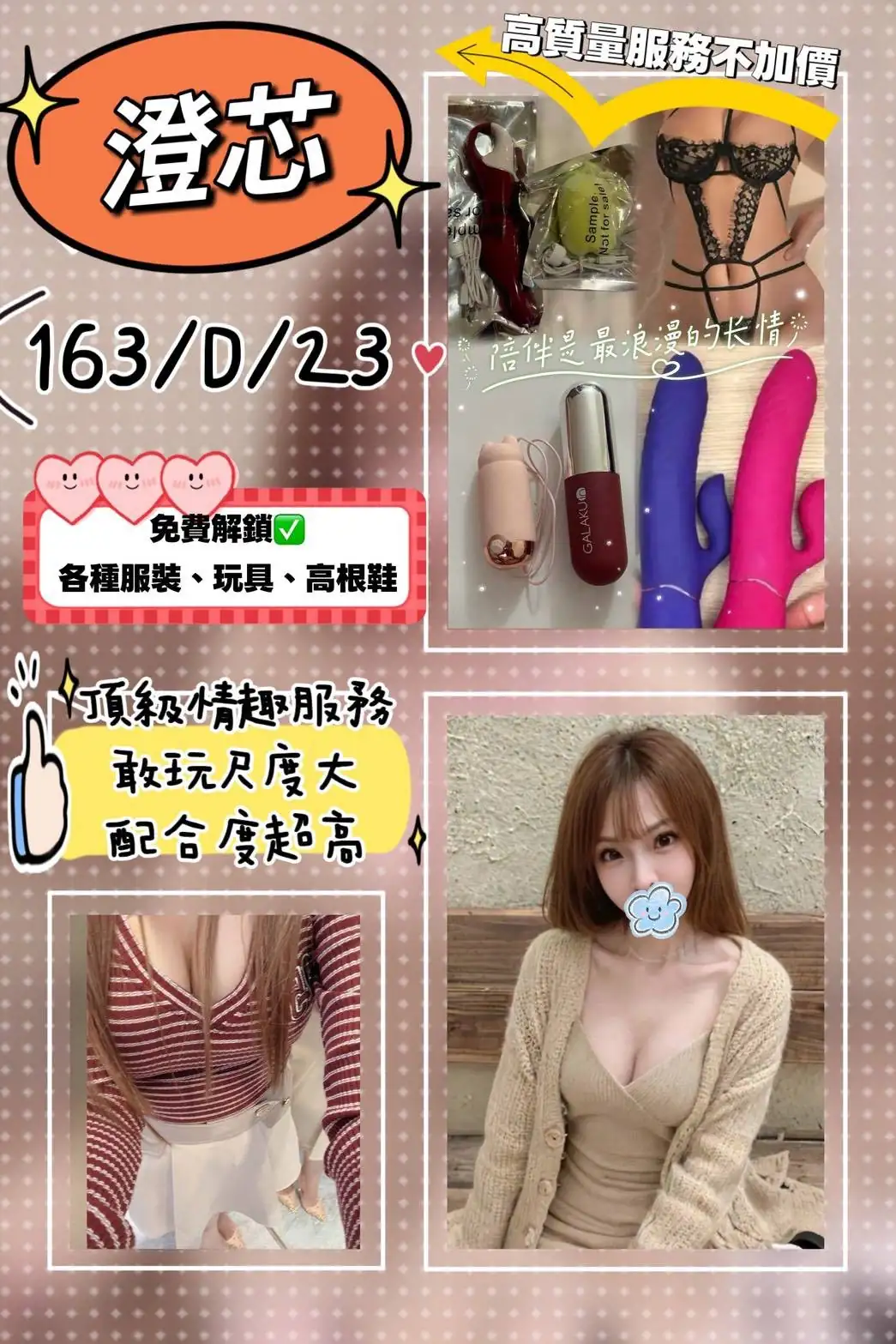 可配合 :69,共浴,LG(舌吻)依氣氛衛生而定,可親嘴,無套吹,口爆,品鮑,奶推,玩具(按摩棒),玩具(跳蛋),情趣用品(客自備),無套做