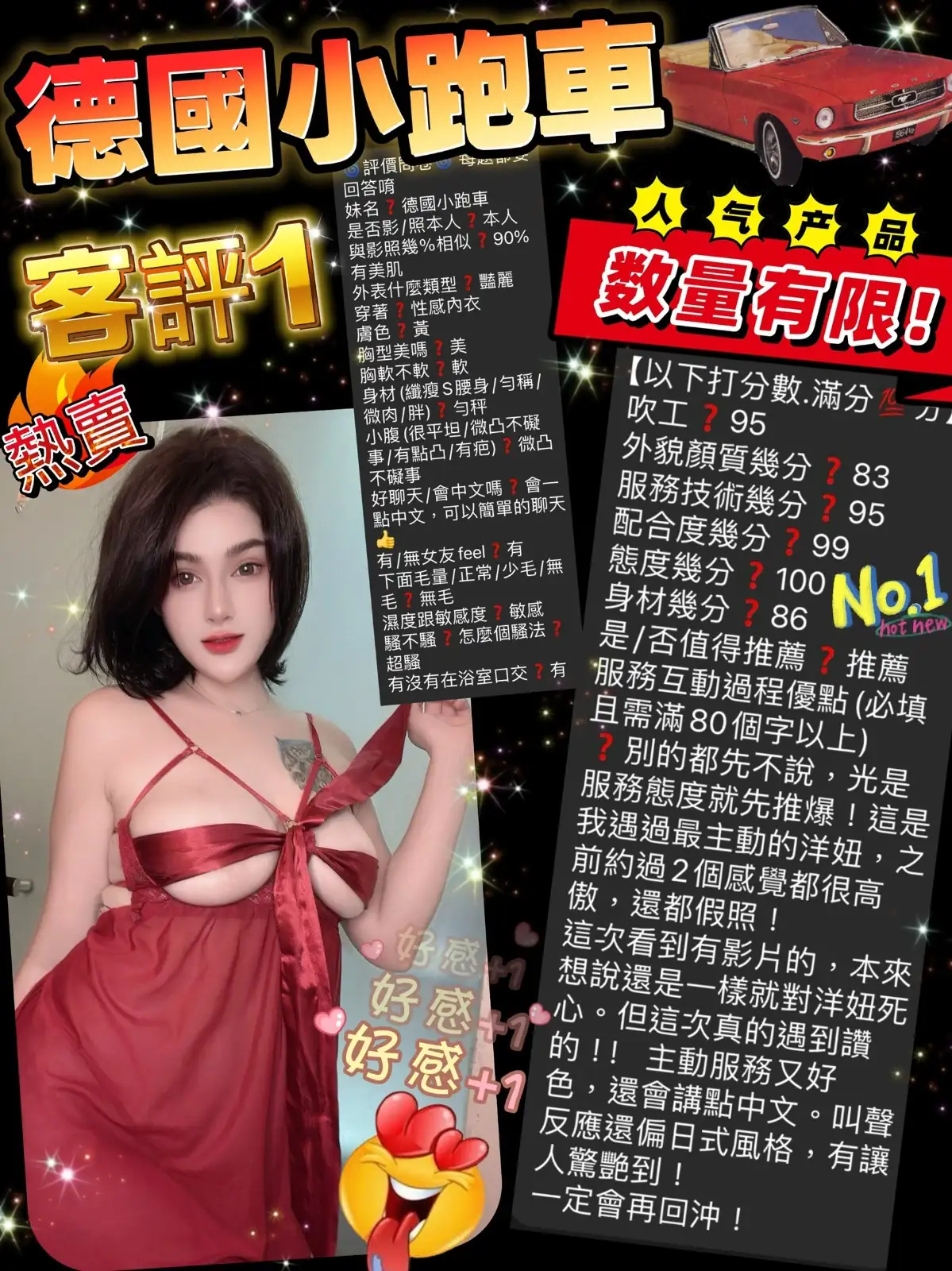 可配合 :奶砲,按摩,殘廢澡,LG(舌吻)依氣氛衛生而定,可親嘴,無套吹,口爆,舔蛋,顏射,浴中蕭,深喉嚨,艷舞秀,跳跳糖吹簫,變裝(自備免付),絲襪,玩具(按摩棒),玩具(跳蛋),情趣用品(客自備),後門,自慰秀,攝影,中文溝通,快餐,2S,包夜,射後清槍