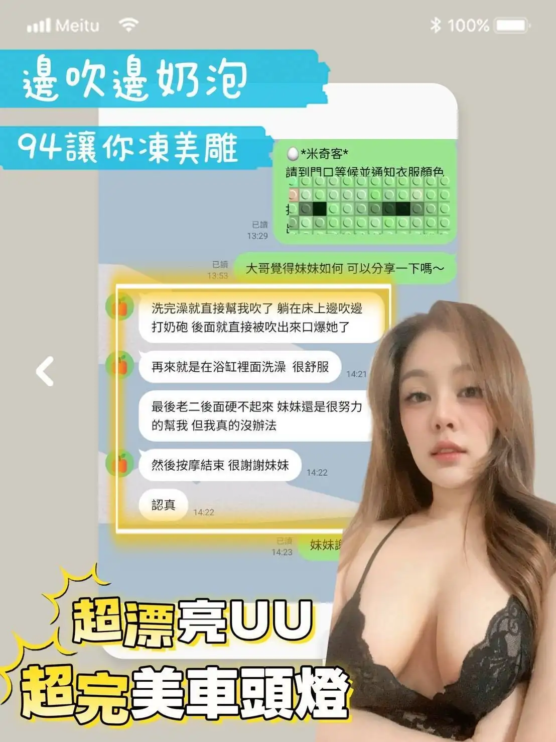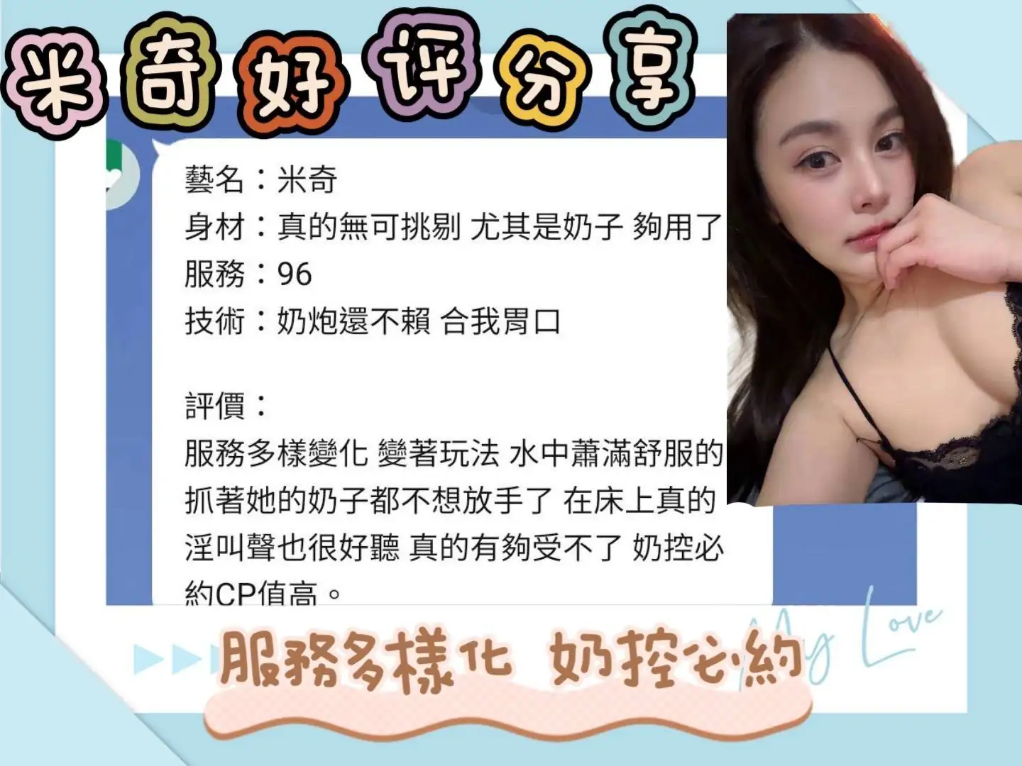 可配合 :奶砲,按摩,69,共浴,可親嘴,無套吹,口爆,品鮑,奶推,屁推,冰火,浴中蕭,變裝(自備免付),絲襪(自備免付),玩具(按摩棒),玩具(跳蛋),自慰秀,快餐,2S