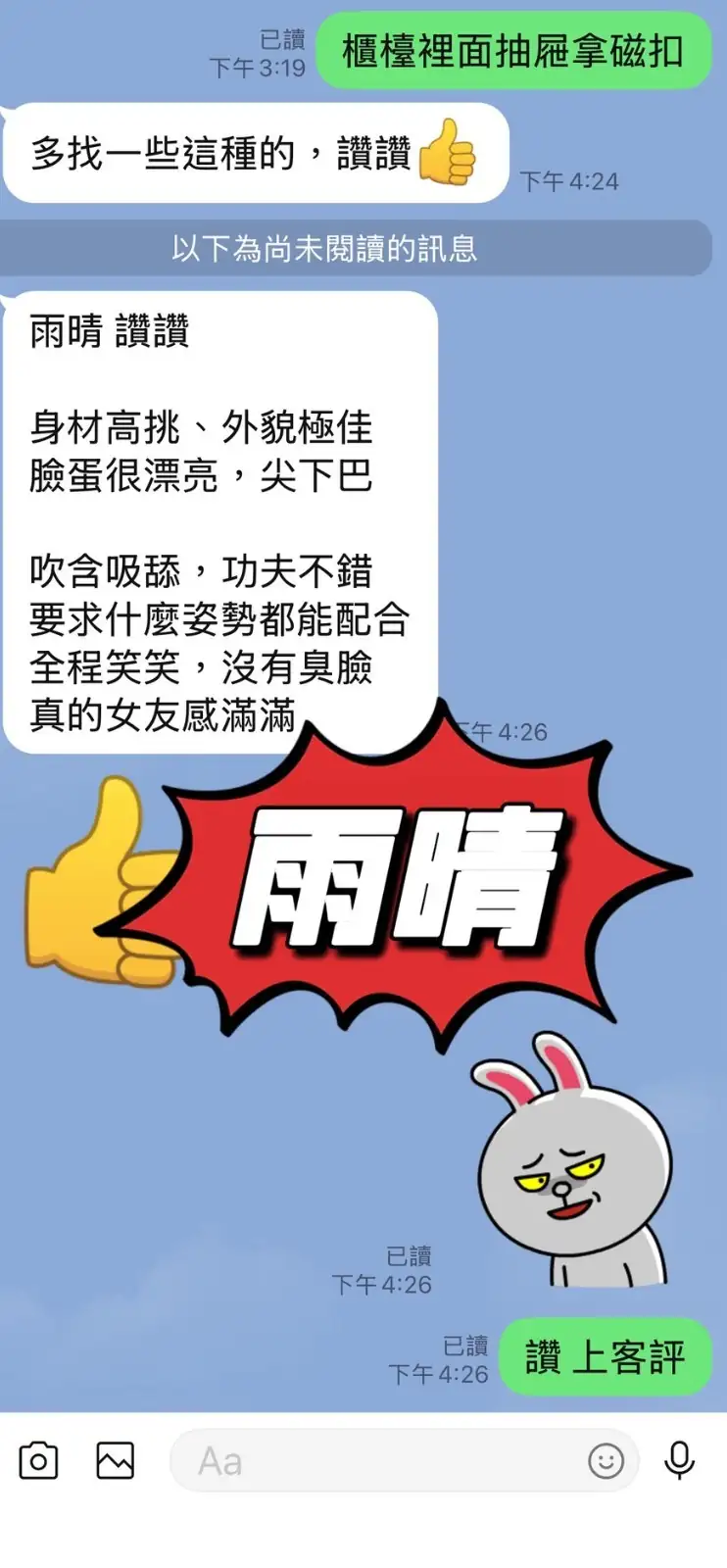 加價項目 : 2S+500,自慰秀+500,顏射+500,口爆+500,口爆吞精+1000,無套內射+1000,攝影+1000(不露臉)