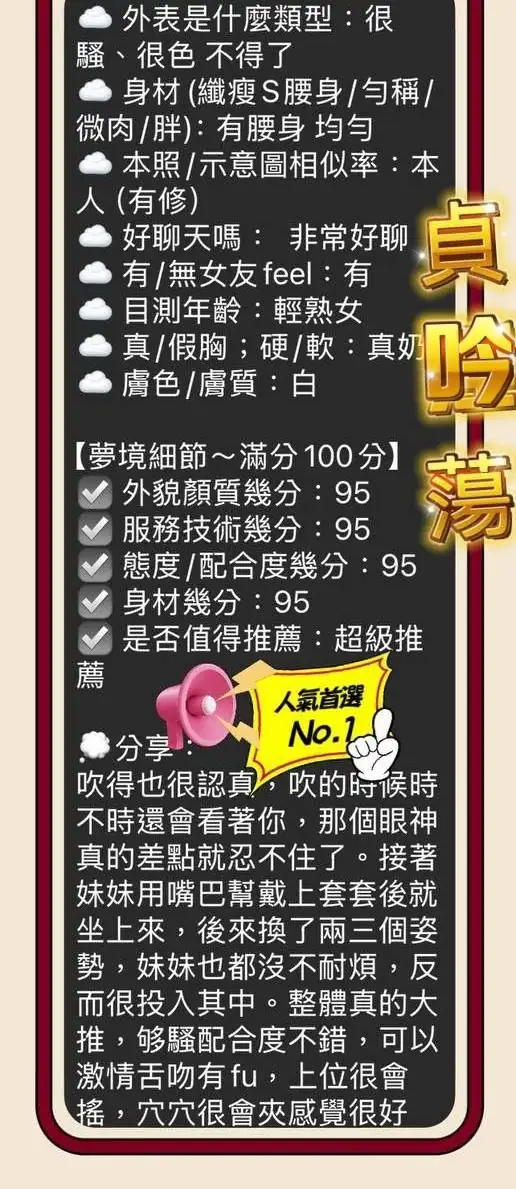 可配合 :奶砲,毒龍,按摩,共浴,泰國浴,LG(舌吻)依氣氛衛生而定,可親嘴,無套吹,口爆,吞精,品鮑,舔蛋,過水,漫遊,冰火,顏射,海底撈月,變裝,絲襪,玩具(按摩棒),玩具(跳蛋),情趣用品(客自備),無套做,後門,快餐,2S