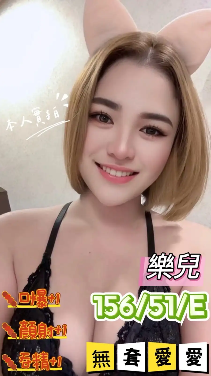 可配合 :奶砲,按摩,69,共浴,LG(舌吻)依氣氛衛生而定,可親嘴,無套吹,口爆,吞精,品鮑,舔蛋,顏射,絲襪,絲襪(自備免付),玩具(按摩棒),玩具(跳蛋),無套做,無套內射,自慰秀,中文溝通,英文溝通,快餐,2S,NS