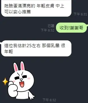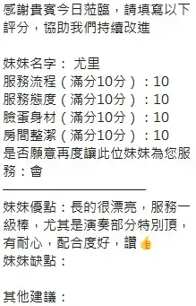 可配合 :奶砲,按摩,69,共浴,LG(舌吻)依氣氛衛生而定,可親嘴,無套吹,品鮑,舔蛋,奶推,屁推,水床浴,變裝(自備免付),絲襪(自備免付),後門,快餐,2S