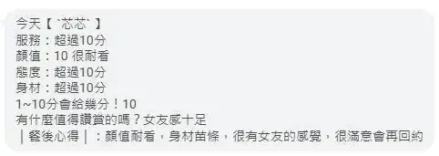 可配合 :奶砲,按摩,69,共浴,LG(舌吻)依氣氛衛生而定,可親嘴,無套吹,品鮑,舔蛋,變裝(自備免付),絲襪(自備免付),中文溝通,快餐,2S