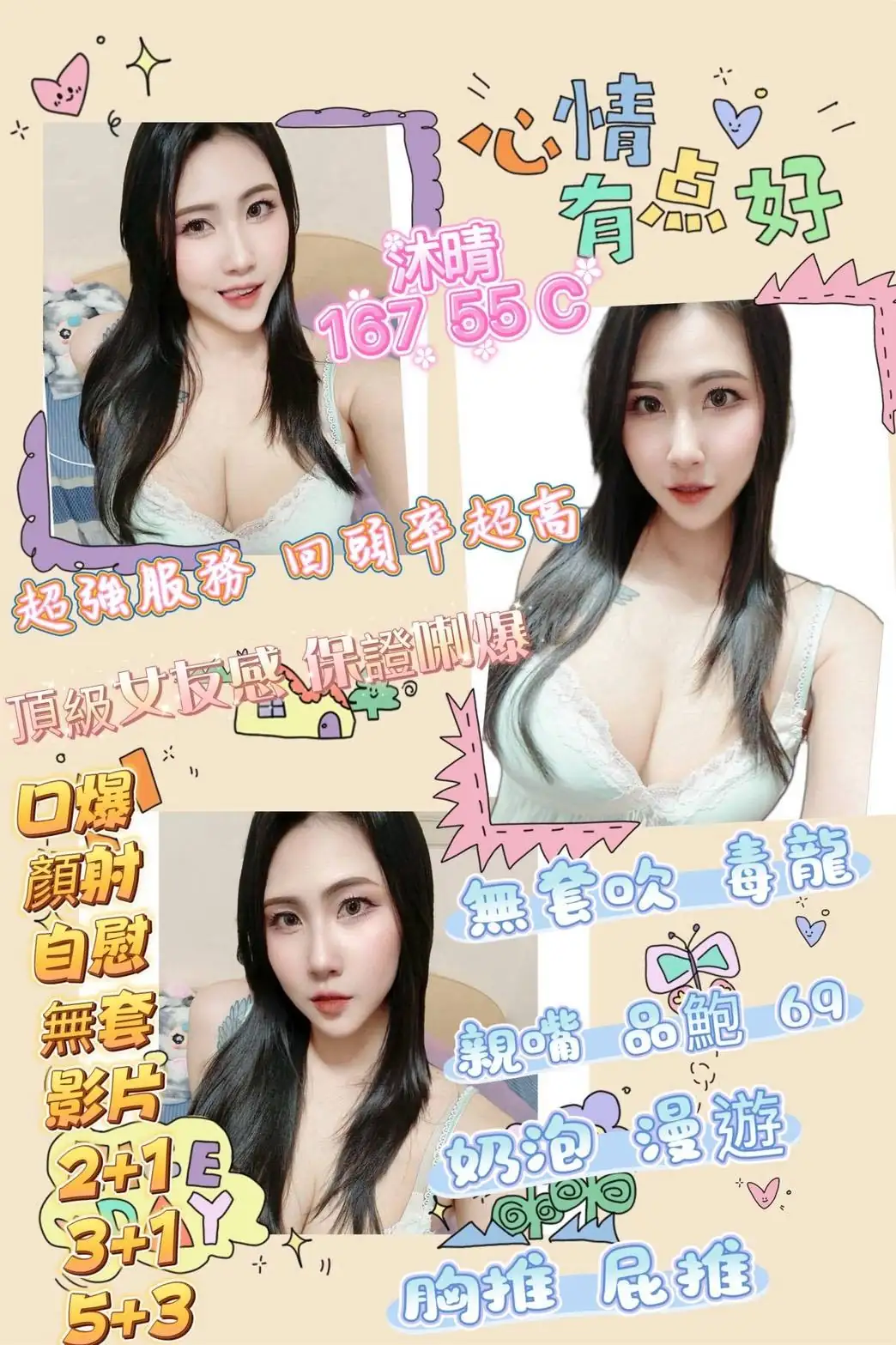 加價項目 : 2S+500,顏射+500,口爆+500,自慰秀+500,無套內射+1000,攝影+1000(不露臉)