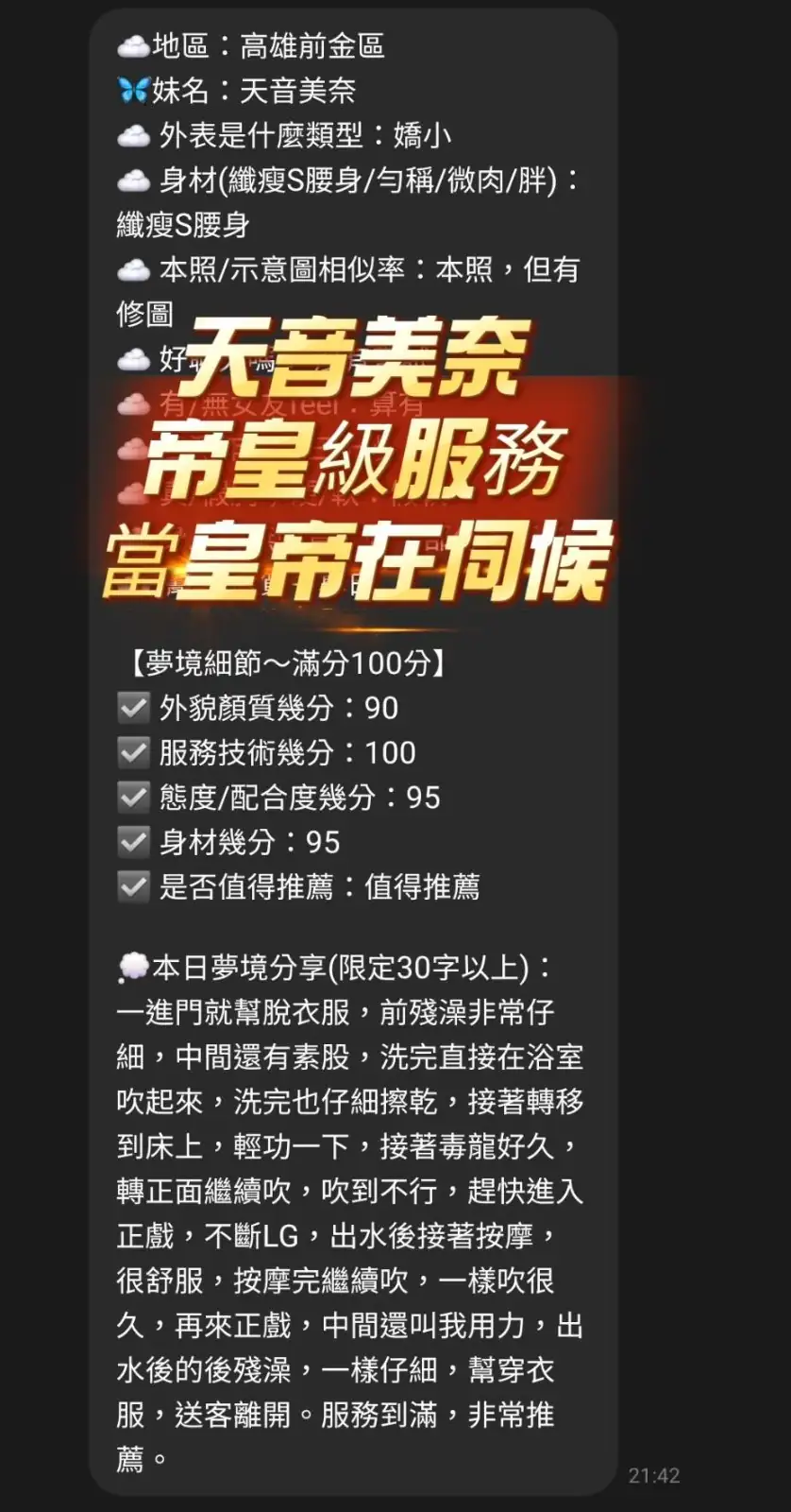 不接受 : 酒客,毒品,陌生客,皮膚異常者,性癖好特殊者