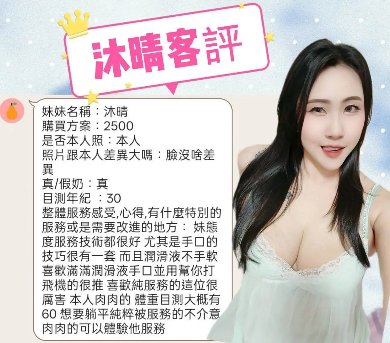 加價項目 : 2S+500,顏射+500,口爆+500,自慰秀+500,無套內射+1000,攝影+1000(不露臉)